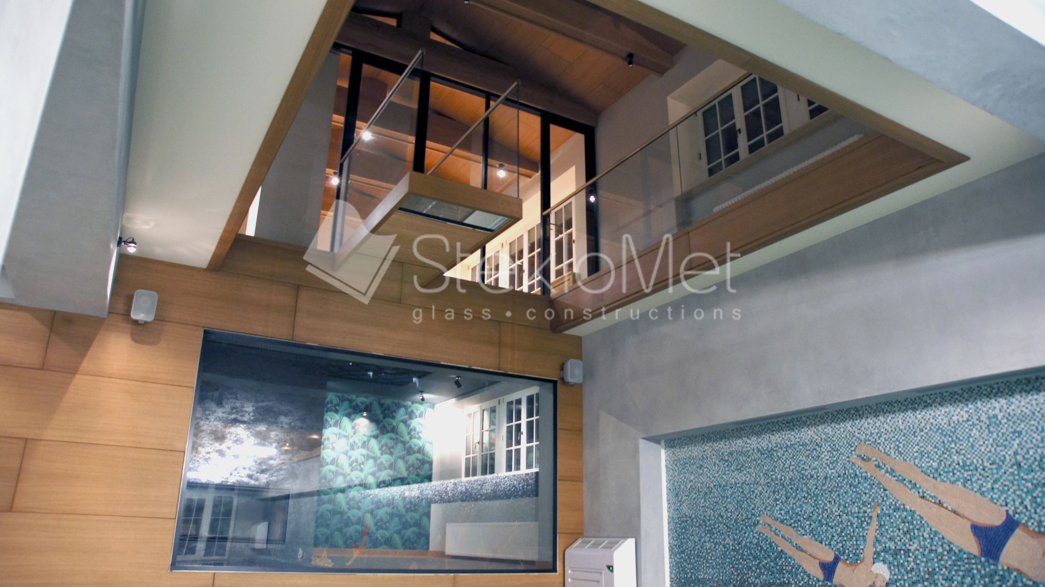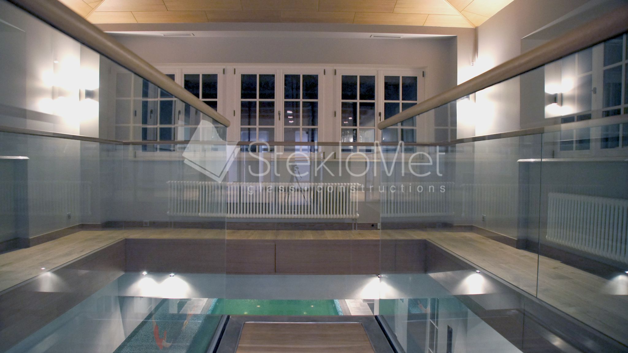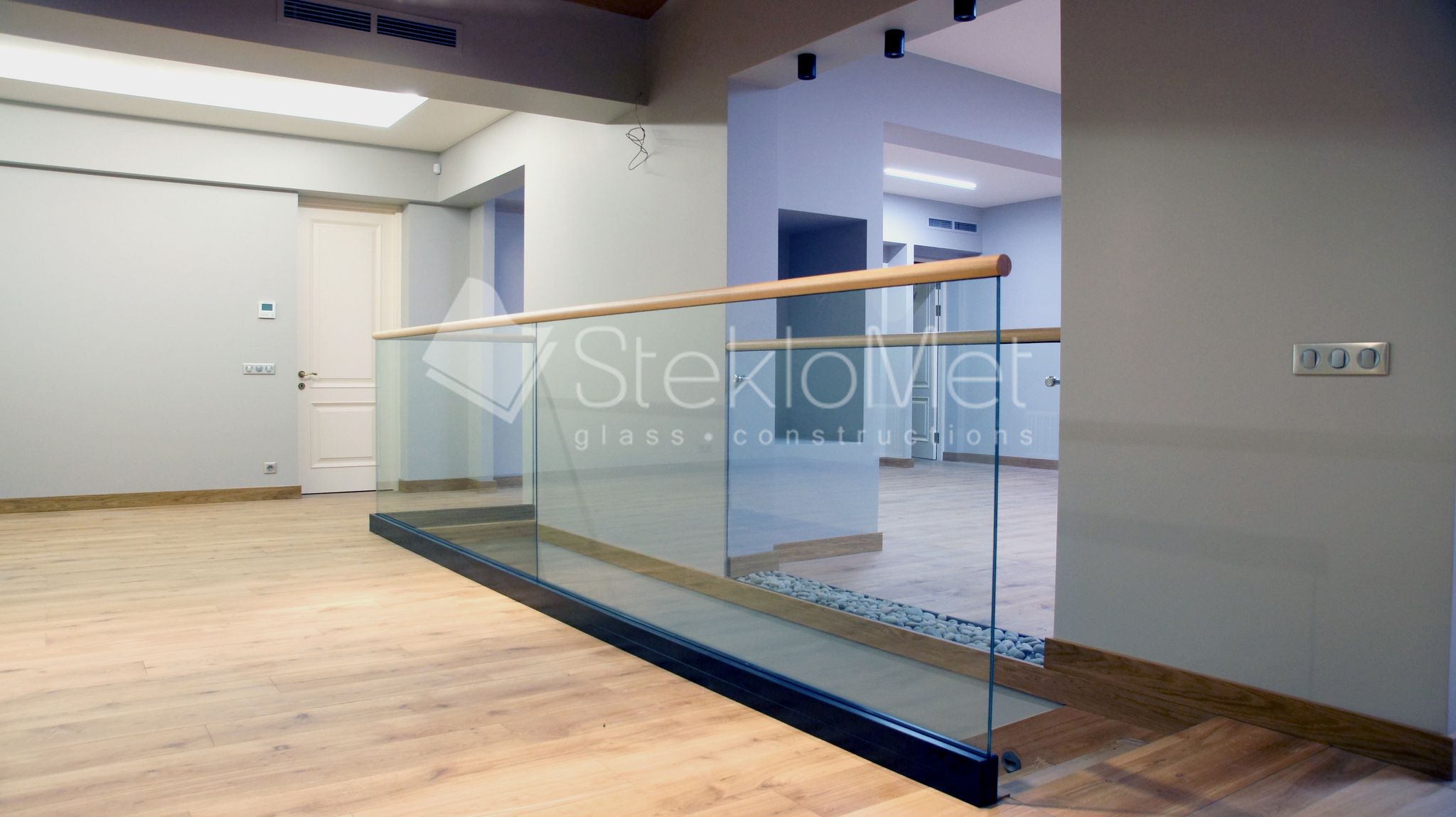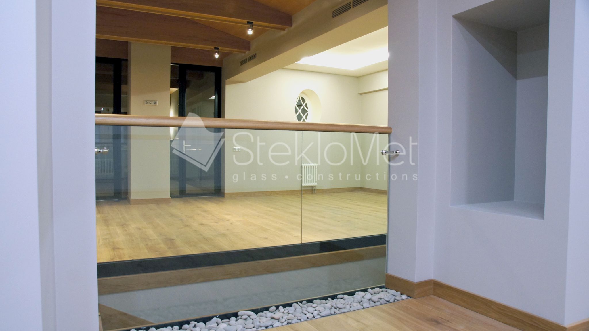 - стеклянная глухая перегородка из зоны отдыха