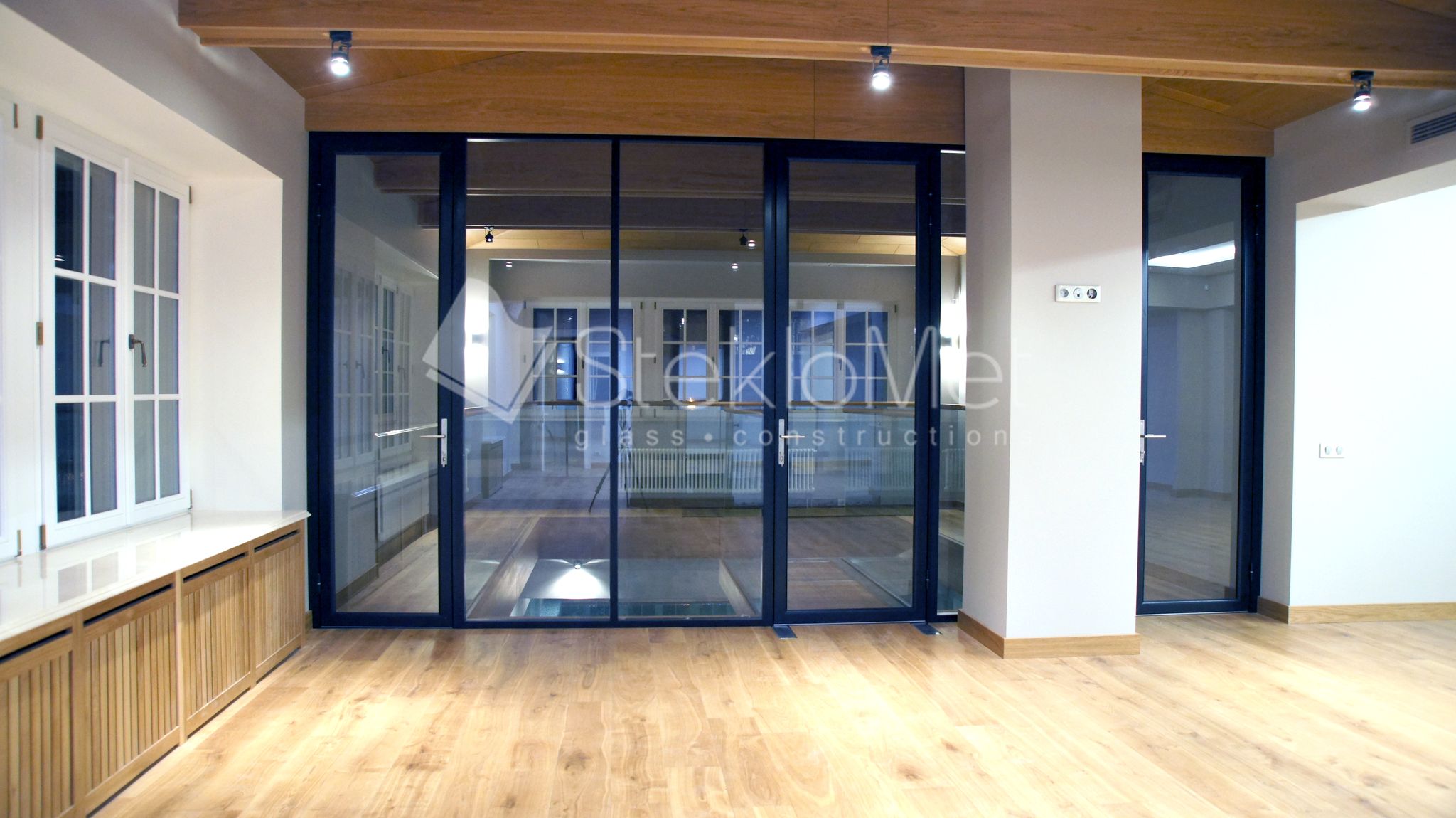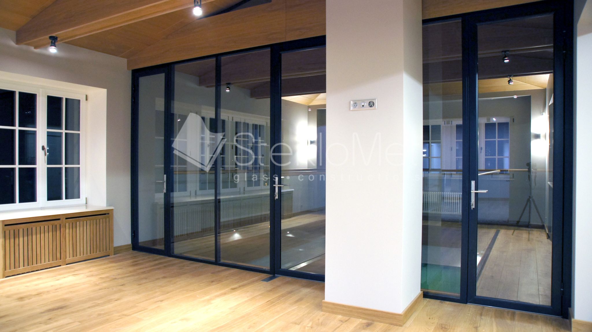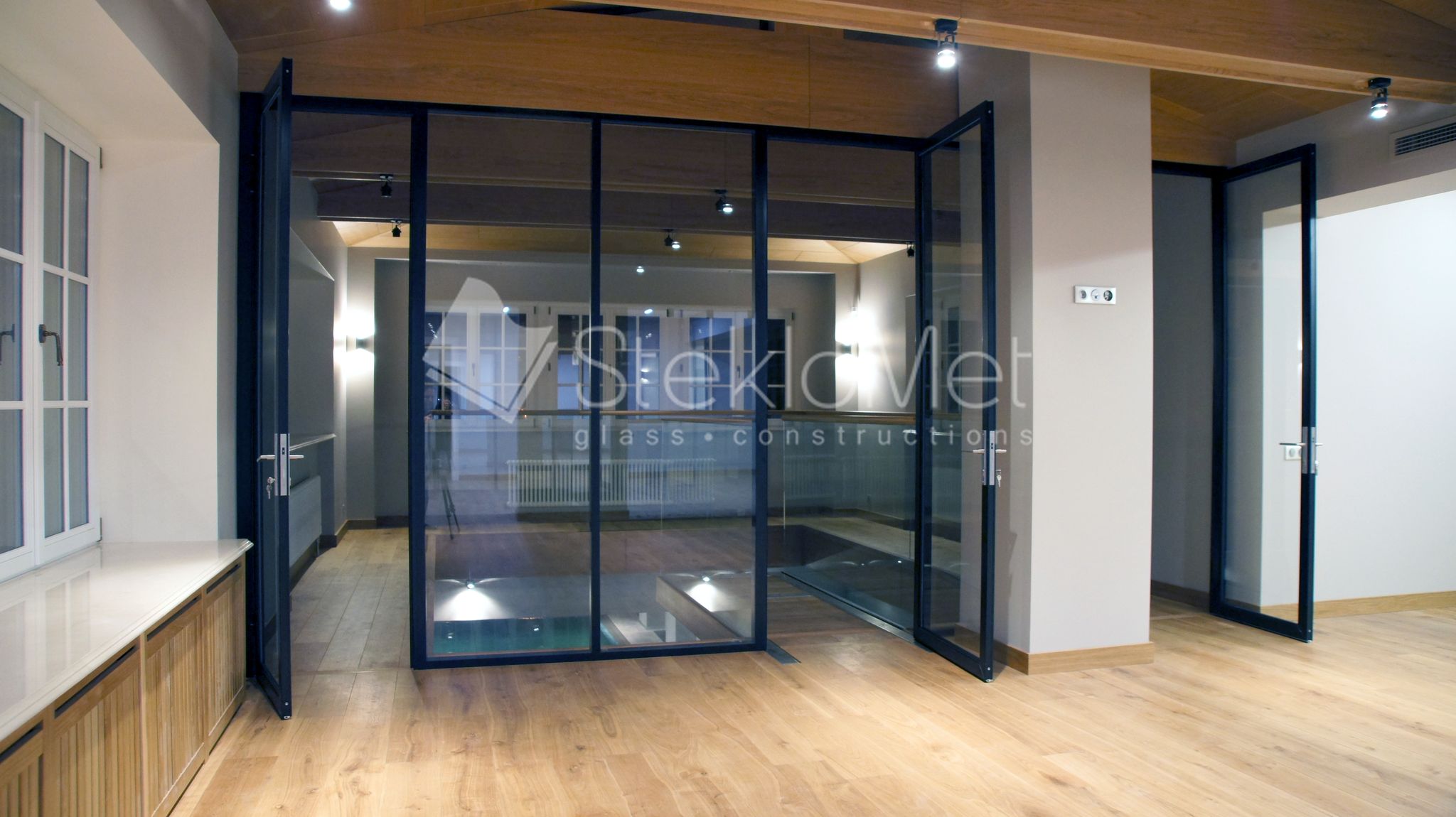 - стеклянная перегородка в стиле лофт с тремя распашными дверями